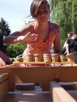 Das Ziel ist es, 30 Holzscheiben (oder Pucks) zum Ende des Brettes zu schieben und zu versuchen, sie durch vier kleine offene Bögen zu bringen, die von links nach rechts nummeriert sind: 2, 3, 4, 1.